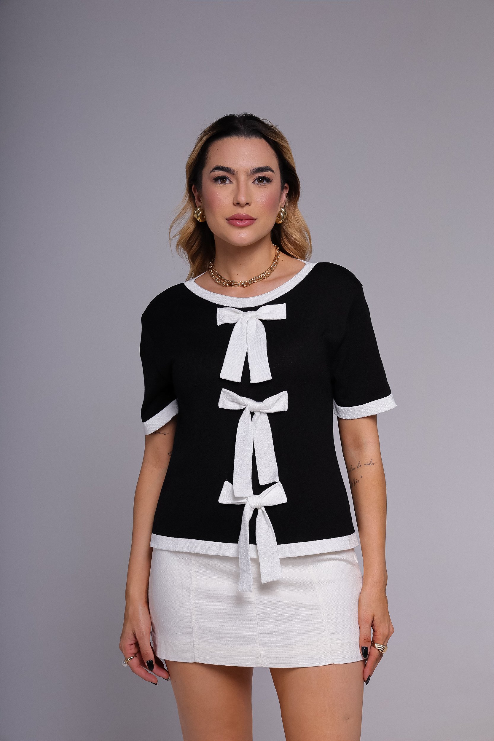 Com aplicações de três laços, esta peça é a tendência da estação, trazendo um toque romântico e moderno. Feita de modal suave, oferece um caimento fluido e agradável ao toque, perfeita para qualquer ocasião.