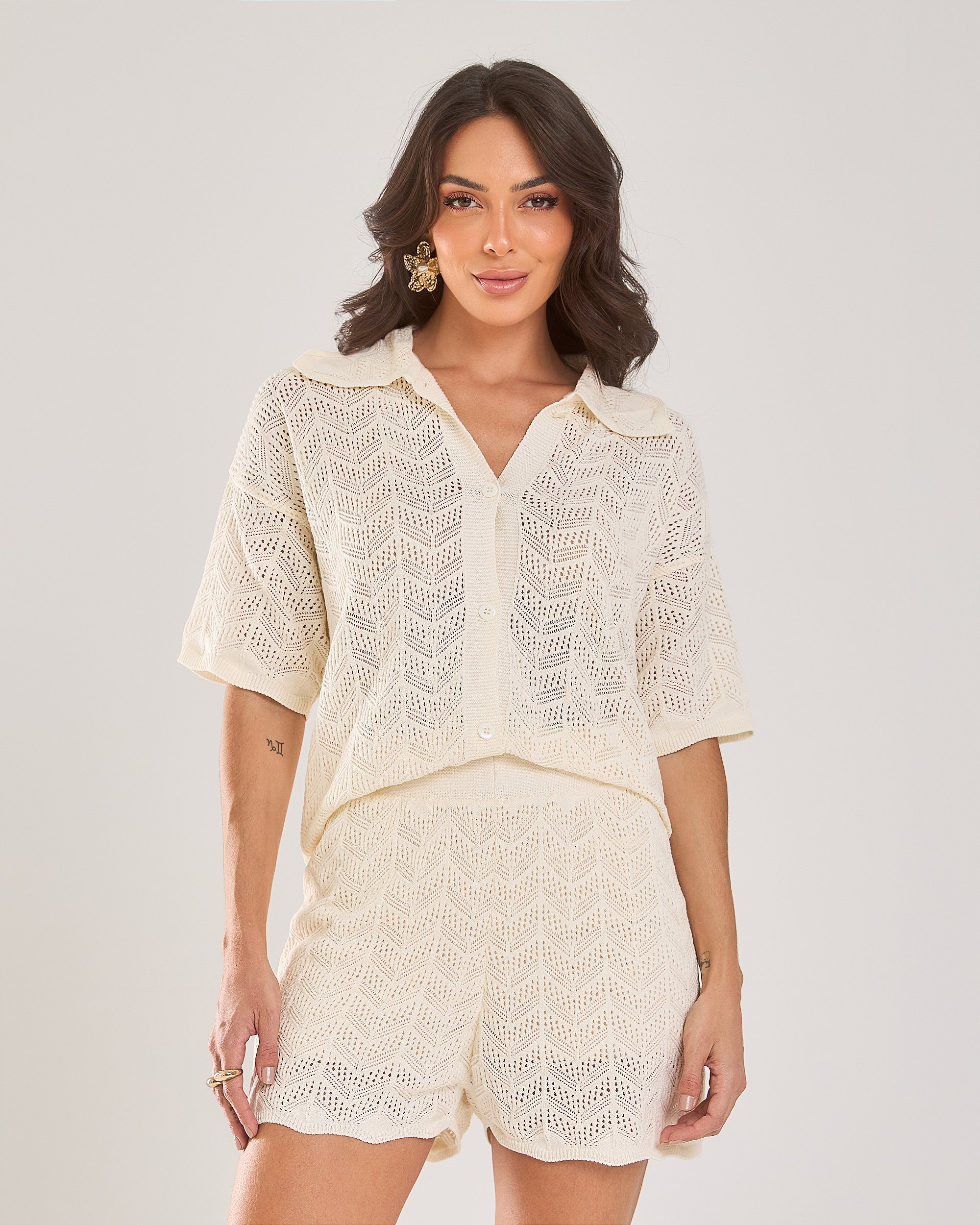 Um look leve, delicado e superestiloso! Este conjunto em modal freddo traz um visual rendado moderno, com textura vazada em zigue-zague que remete ao crochê, garantindo frescor e charme. A blusa estilo camisa tem caimento soltinho, gola tradicional e fechamento frontal com botões — perfeita para usar sozinha ou como sobreposição.